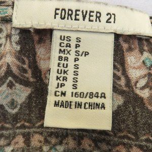 Cute tunic tank is lightweight with stretch. Main color is soft brown with patterns in creamy/taupe, muted coral and touches of turquoise/aqua.