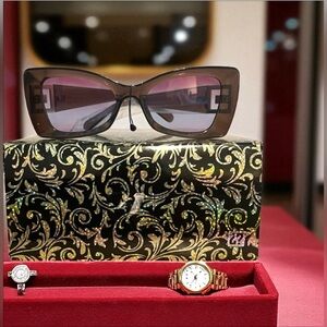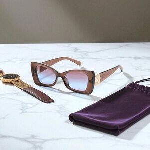 These sunglasses boast a bold geometric frame in a rich brown hue, paired with gradient lenses that shift from brown to light blue. The metallic gold accents on the temples enhance their contemporary and luxurious appeal.