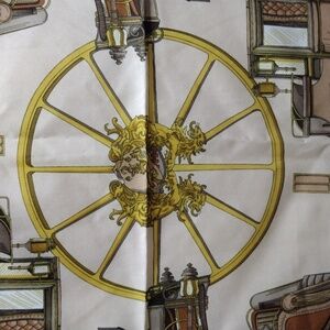 This square scarf features a stunning Carrossier carriage print in brown, gold, tan, and grey, measuring 30x30 inches. Its vibrant and colorful design adds a touch of elegance and sophistication to any outfit. In excellent condition, this scarf is perfect for casual and formal occasions, showcasing a luxurious and timeless style. Enhance your wardrobe with this versatile and high-quality accessory.