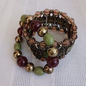 Bronze Metal Stretch Bracelet with brown and green enamel sections, rhinestones, and acrylic beads. Beaded Stretch Bracelet with green, brown, and gold tone acrylic beads.