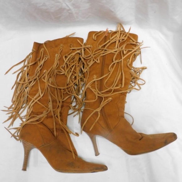 A pair of gently worn light brown heeled boots. Fringe design; ends at middle of calf. Zipper enclosure.