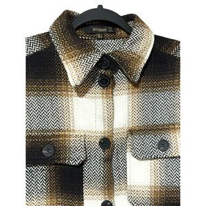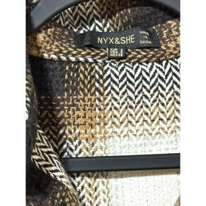 NYX & SHE Browns Tan Neutral Heritage Plaid Flannel Button-Down (Med. Weight) Chor Utility Cottage Shacket Top in a Women's Size (Sm). (New without original tags) Never used, and flawless, and smoke free you will NOT be disappointed! See pictures (part of the item description) for details, conditions, measurements. ~Please measure prior to purchase~ All Measurements are Approximate, not exact, and May Vary Slightly.