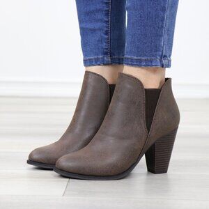 Brown High Heel Slip-On Booties Faux Leather Slip-On Stacked Heel