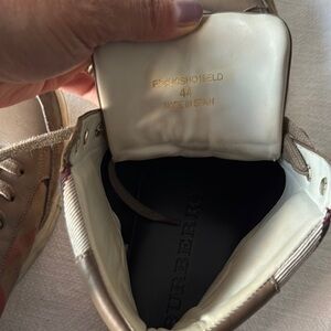Stylish brown high-top sneakers featuring a distinctive checkered pattern. Perfect for casual wear.
