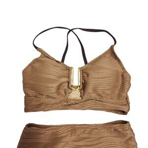 Brown High-Waisted Textured Bikini Set Strappy Back Size S
