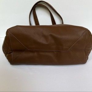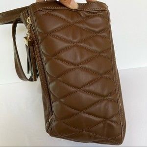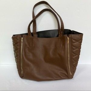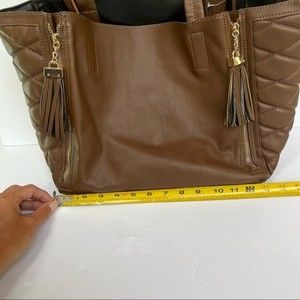 Brown handbag w/quilted sides. Zippers on all 4 corners move. You a little more space in the bag when opened, but I view them more as a decorative detail. There are tassels on the zippers on front. Interior back wall pocket. Detachable zip pouch on inside is about 14”x9”. This piece looks to have a little wear on the strap from rubbing against inside of the bag (see photos). Though pre-owned, this bag doesn’t appear to have actually been used. Looks like it just sat in closet. I couldn't find any branding on this bag. Mercari didn't permit me to include 2 other photos of what appears to be the same bag in different colors listed by other sellers. Based on these photos of what looks like the exact same bag, with tags, I believe the brown bag I'm selling is an INZI bag. Double handles are about 9" long. No Brand only b/c Mercari didn't have this brand. The others I found INZI bags I found online that looked just like this said they were leather. I couldn't find a materials tag on this one.