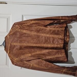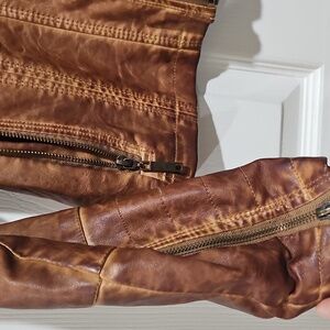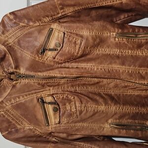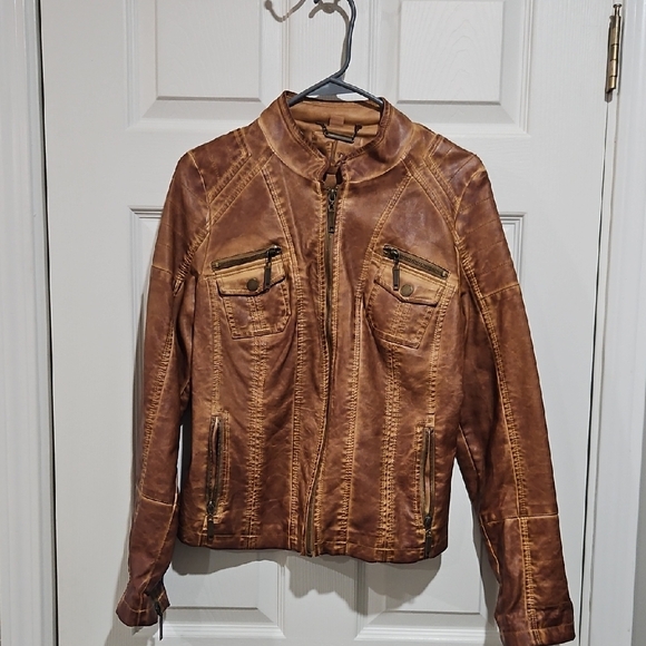 J2 brown leather LIKE jacket. It has front zip up pockets and breast pockets as well ( mock neck). Also has zippers on the sleeves. It is a fitted distressed look. Great condition