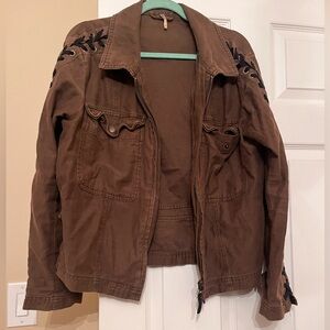 Stylish brown jacket featuring black embroidery on the shoulders. Perfect for a casual look.