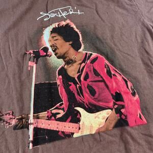 A brown distressed band tee featuring Jimi Hendrix playing the guitar with his printed autograph, size medium. In excellent preloved condition. Check photos for details of the distressing on the hems, looks very punk/grunge.