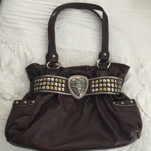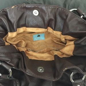3 exterior pockets, magnetic snap closure, 4 interior pockets. Slight wear but in good condition. Very durable bag with mixed metal tones.
