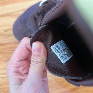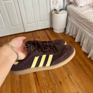 Lightly used Brown sambas from Dick's with knitting and yellow side stripes! Perfect for Fall and Spring.