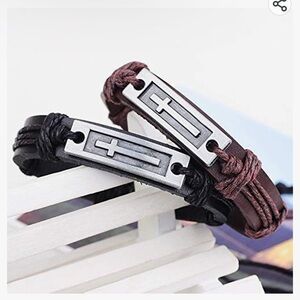Brown LEATHER Cross Charm Adjustable Bracelet