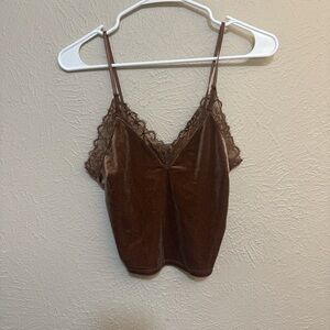 Elevate your style with this elegant brown velvet cami top featuring delicate lace trim. Perfect for a chic and sophisticated look. Size M, but fits as S. In very good condition