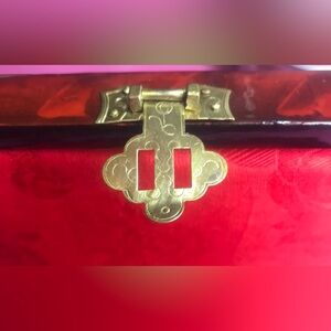 This Vintage Brown Lacquer with Gold Latch and Mother of Pearl Shadow Box Top Red Satin with Roses on Inside is in good condition. The latch works but is a little bent. The fabric on one side of inside lid has come away from side. See pics. Otherwise in great condition. Measures 7.5” wide x 4.5” deep x 2.75” tall.