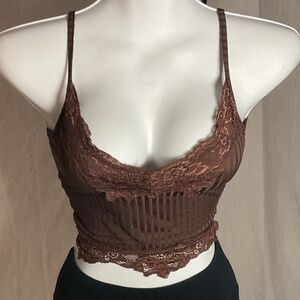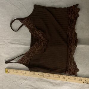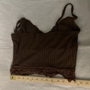 Dark brown crop top with lace on front of v-neck collar and around bottom edge. Ribbed stretch fabric and thin straps. In fair condition - some loose threads as shown in pictures, still ready to wear.
