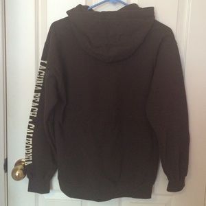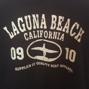 Bought from a small boutique in Laguna Beach. Very comfortable. Worn once. Has a hood. Has a kangaroo pocket in front. Missing drawstring around hood.