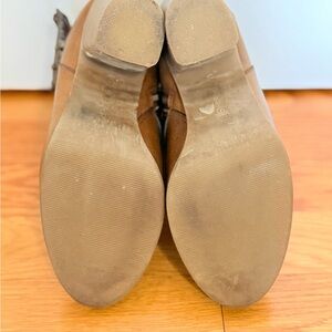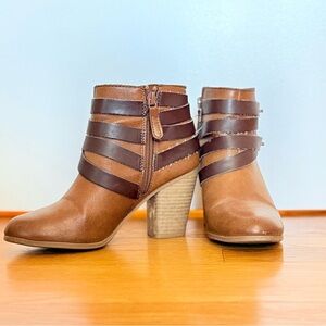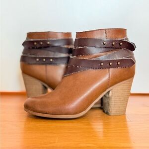 Brown leather wedge ankle boots. Featuring darker brown straps.