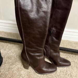 These are brown (almost burgandy) high heeled boots. They feature a braid around the edge. They're great for fall with a skirt to show the details.