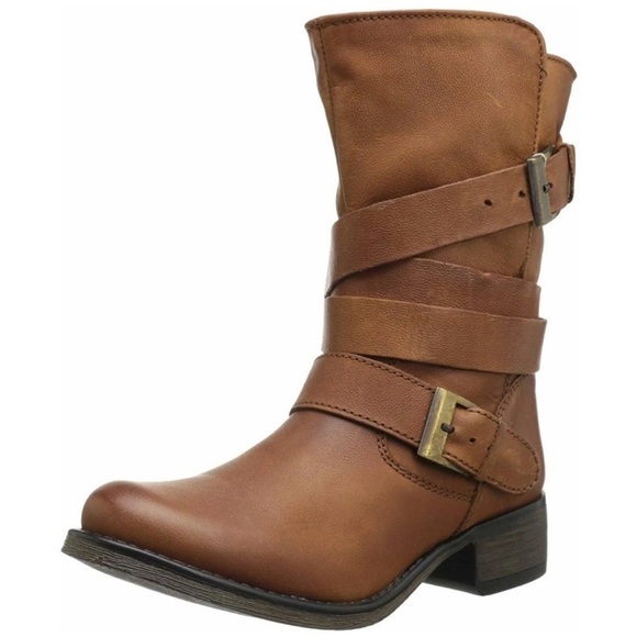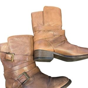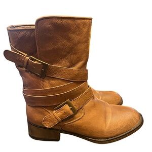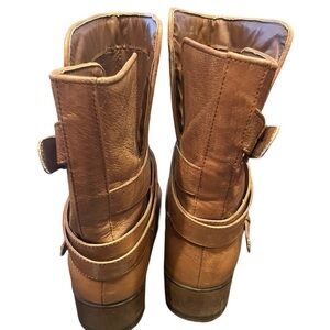 Stylish brown leather boots. Features buckle straps. Perfect for a rugged look.