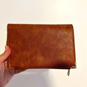 Brown crossbody bag from STITCH FIX with gold tone hardware, featuring a front zipper pocket and interior zipper pocket, and a strap.