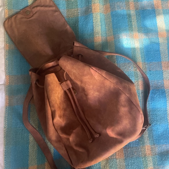 Stylish brown leather backpack with drawstring closure. Perfect for everyday use.