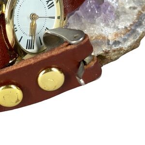 This unique piece of jewelry is perfect for any occasion, whether it's a casual day out or a special event. The brown leather strap belt is adorned with gold studs and wraps around your wrist. The buckle closure keeps it secure and comfortable to wear.