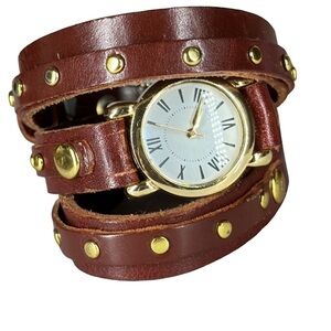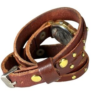 Brown Leather Gold Studded Wrap Long Belt Strap Bracelet Watch 25 mm Biker Moto