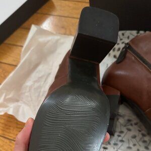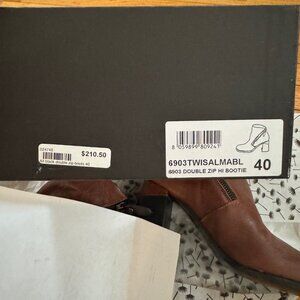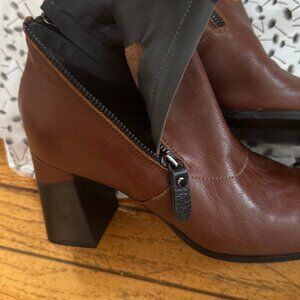 Brown Leather Heeled Bootie DOUBLE zippers Sz 40 (equivalent 8.5 - 9). Tried on, never worn. Like New with box. Boots can zip up on both sides, either inner or outer. Heel height about 3 inches, see photo.