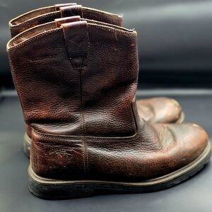 These brown leather boots feature a textured upper and a classic pull-on design, offering a rugged and durable style. With a mid-calf height and a rounded toe, they are perfect for everyday wear and built to withstand the elements.