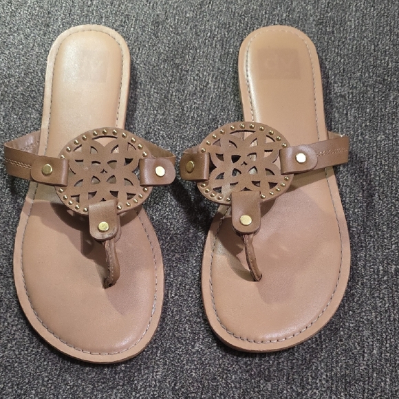 Stylish brown leather sandals with intricate cut-out design. Perfect for casual outings.