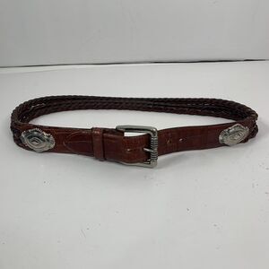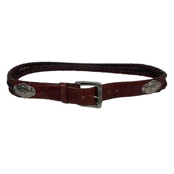 Brown Leather Size M Croc Embossed Braided Belt Silver Tone Heavy Buckle Concho