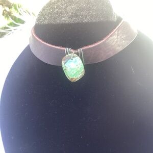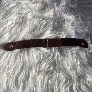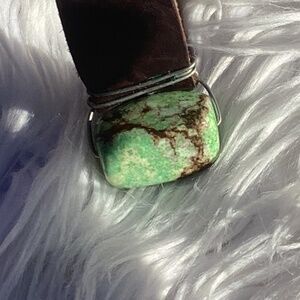 This bracelet has a beautiful butter soft snap close wrist strap attached with metal straps to the turquoise stone in the middle. There is a lot of marbling in the turquoise. It’s very pretty and very large. This is a rustic Boho 70s style bracelet. There is one white spot seen on the leather that I’m unable to remove.