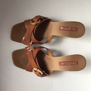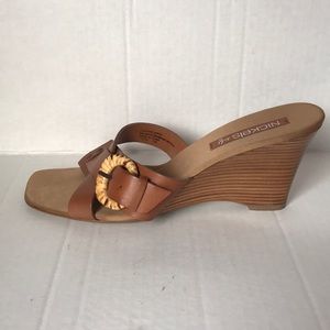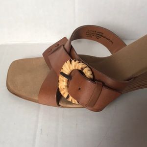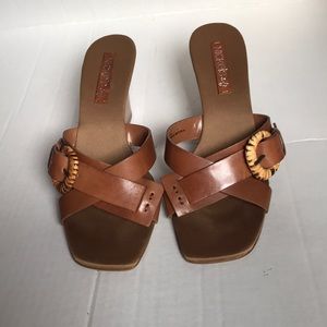 Brown genuine leather sandals with a wooden wedge heels in a size seven. Trendy Square toe and crisscross design.