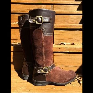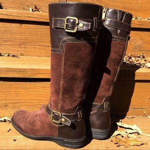 Brown Leather Stitched Belted Brass Buckled Suede Fall Winter Knee High Boots