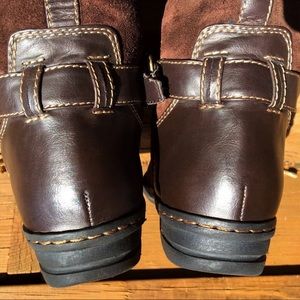 This is a rugged pair of chocolate suede brown winter boots handsomely crafted with brass buckles and flexible water resistant rubber souls