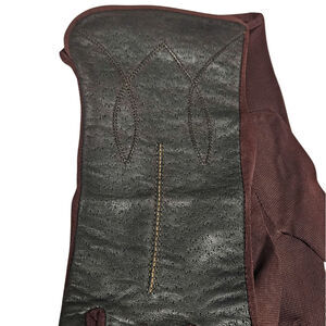 Vintage Brown Leather Top Driving Gloves Polyester Bottom Gently Used Size 7 Womens. Intricate seam details on wrist and top. Pinhole leather design.
