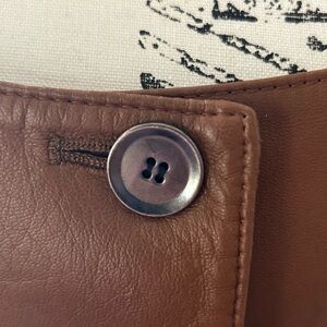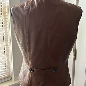 This brown leather top offers a sleek and tailored silhouette, perfect for adding a touch of elegance to your ensemble. Crafted from high-quality leather, it features a smooth finish that complements both professional and casual settings.