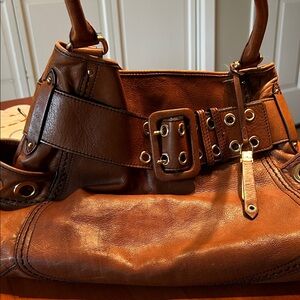 COLE HAAN preowned toffee colored leather women's bag with stylish buckle and ring accents. Boho Style. 17x11x6. Very roomy.