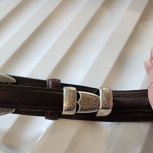 Stylish western brown leather belt featuring elegant silver accents. Perfect for adding a touch of sophistication to any outfit.