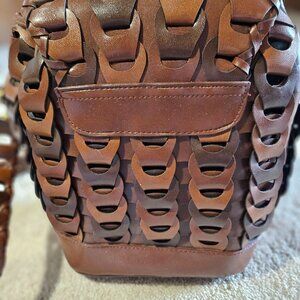 Brown Leather-Look Hobo bag with weave design. Has drawstring and snap closure. Has zippered pouch on the bottom. 1 zippered pocket inside. Bag is 10" high. Strap is 40" Long. Very clean - in good condition.