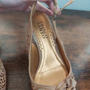 These are gorgeous short heels by Franco Sarto in size 7.5. They have normal wear and staining on the bottom. Ankle is adjustable. The leopard pattern is a fur texture. About 3 inches tall. originally $100.