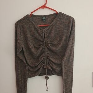 Wild Fable long-sleeve ribbed top in excellent used condition (EUC), size S. Features a ruched front with an adjustable drawstring for a customizable fit. The fabric has a soft, stretchy feel, and the earthy brown tone adds a trendy touch. Perfect for casual or layered looks!