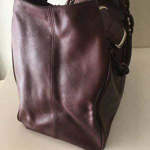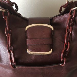 Mahogany brown leather shoulder bag with brown plastic chain link straps. Magnetic closure and one zip interior pocket and one slip pocket. Great for everyday tote. Measures 14" x 12" x 7". Never used!!