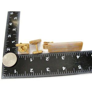 Brown Marble Cufflink & Neck Tie Clip Set Gold Tone Shirt Wedding Tux Vtg