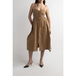 This dress features a classic A-line silhouette and is detailed with buttons down the center. It is made from cotton and polyester, making it lightweight and breezy.