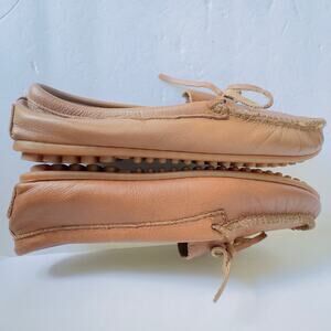 Minnetonka Moccasin Brown Leather Boho Driving Loafers Cabincore Slip-On Shoes. Classic comfortable loafer, lightly padded, rubber sole, adjustable tie. Like new