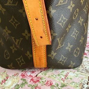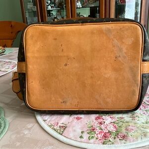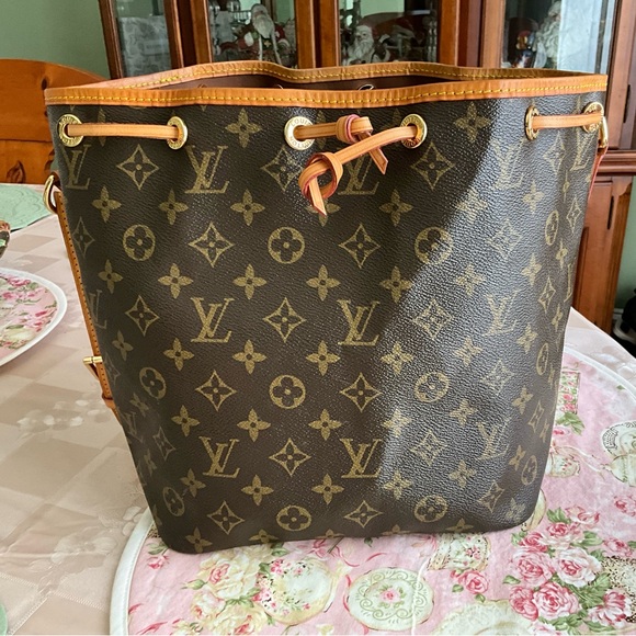 Stylish shoulder bag with iconic monogram. Features a drawstring closure. Perfect for daily use. Vachetta Leather has water spots. Ink spot on strap as shown in picture. Not authentic, but good quality.