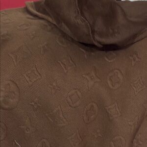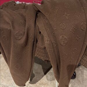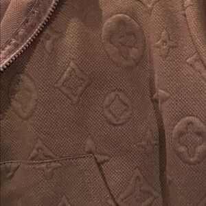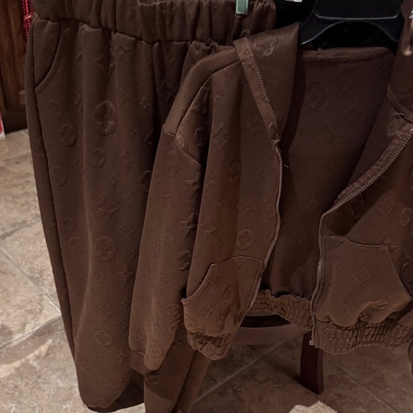 Stylish brown tracksuit with monogram design. Includes a zip-up hoodie and matching pants. The lighting is bad and does not pick up the color. It is a dark brown. It is missing. The little zipper hook is shown in the picture, but it is brand new never used.