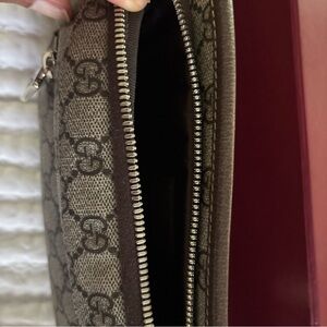 Stylish brown wallet with monogram design. Features a secure zip closure.