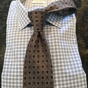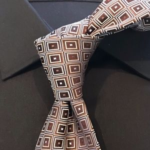 This is a surprisingly well-made tie that can be worn with different patterned shirts and suit coats. it's base color is brown but it has different colors embedded: blue beige and is a great updated look to a traditional business tie.